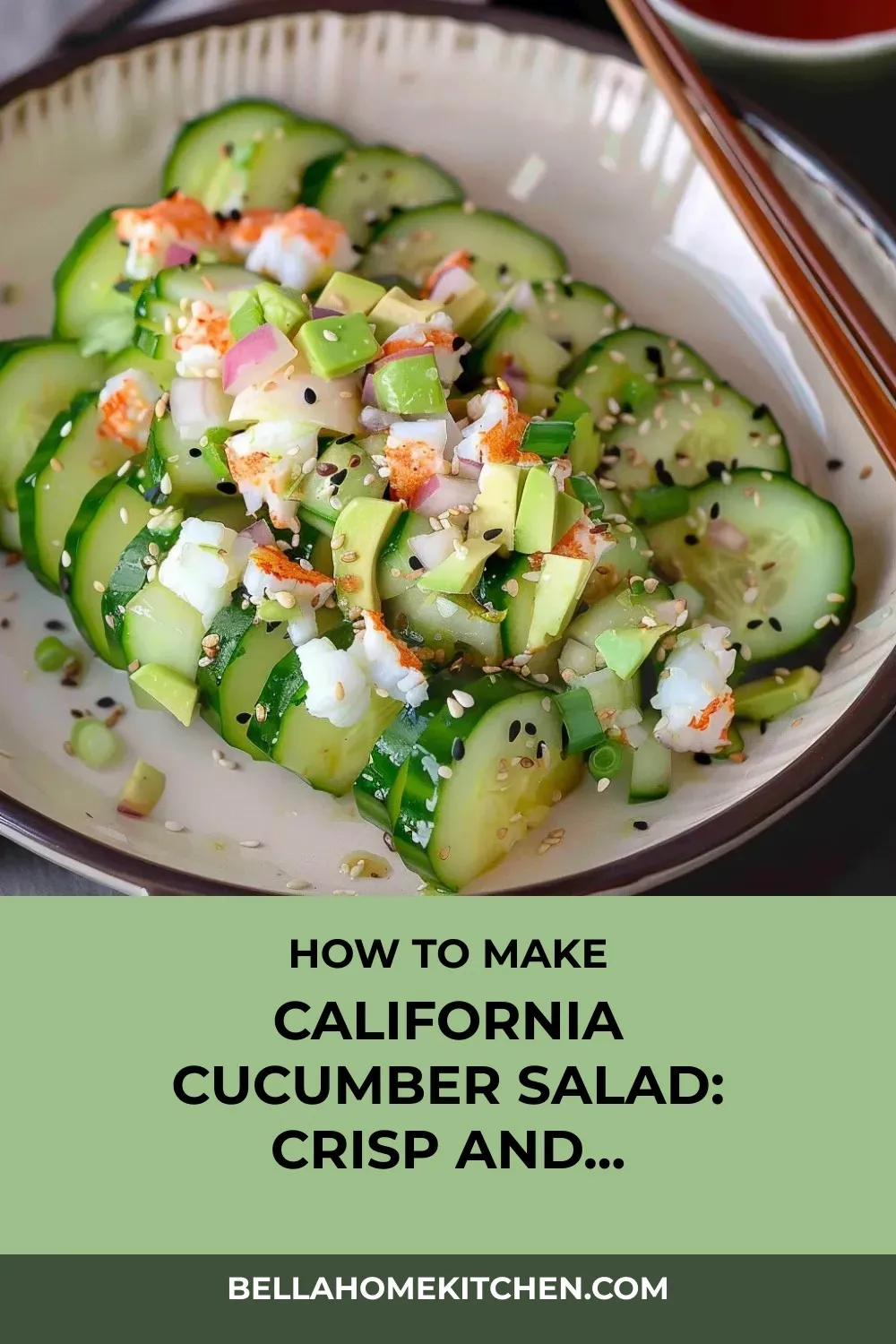 “Crisp cucumber, creamy avocado, and savory imitation crab come together in this refreshing California roll-inspired salad with Kewpie mayo and toasted sesame seeds.”