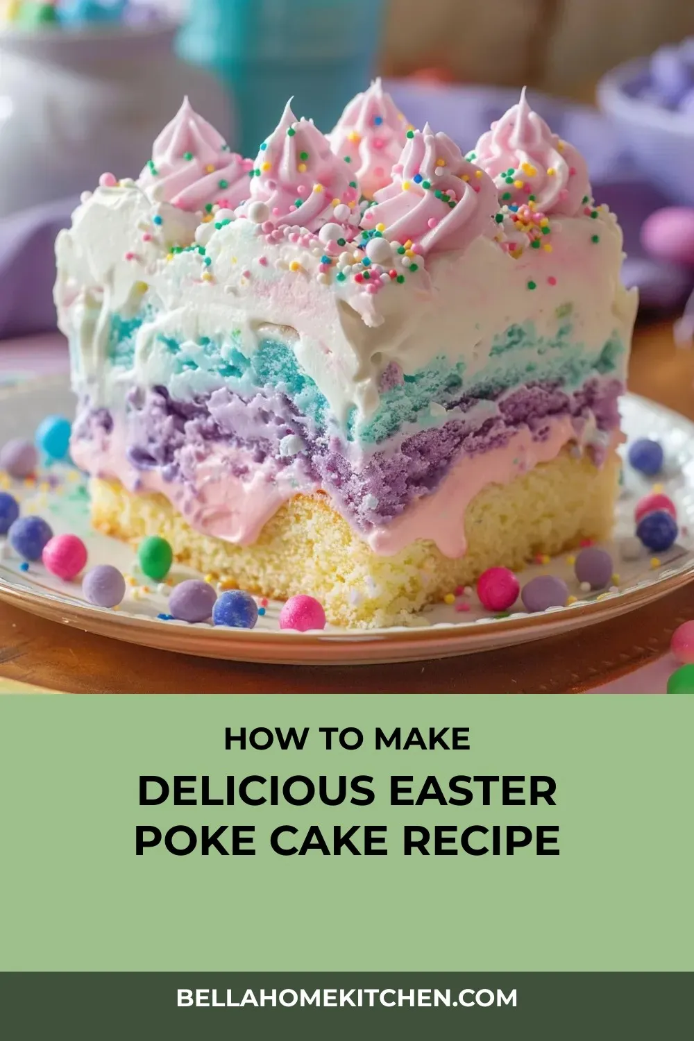 Making this Easter Poke Cake can become a cherished tradition in your family, just as it has in mine. The combination of colors, flavors, and textures creates a dessert that is not only visually stunning but also incredibly delicious. So go ahead, whip up this festive treat, and watch as it becomes a beloved part of your Easter celebrations for years to come. Happy baking and happy Easter with this delightful Easter Poke Cake!