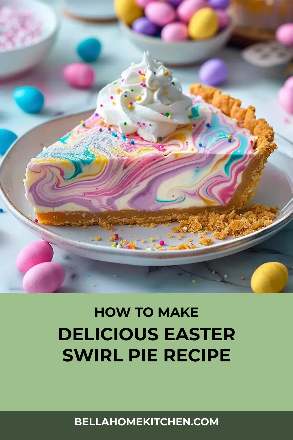 You can make this Easter Swirl Pie up to two days in advance. However, it’s best to add the whipped cream, Easter sprinkles, and mini chocolate eggs shortly before serving to maintain their freshness and appearance.