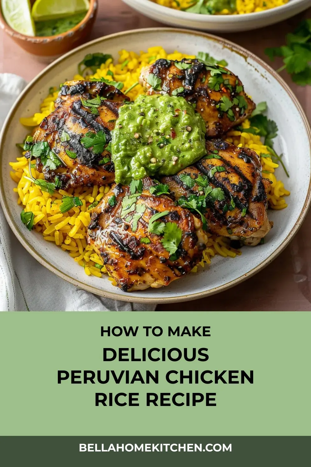 Peruvian Chicken and Rice: Flavor-packed chicken on golden turmeric rice with zesty ají verde sauce – a vibrant, unforgettable meal.