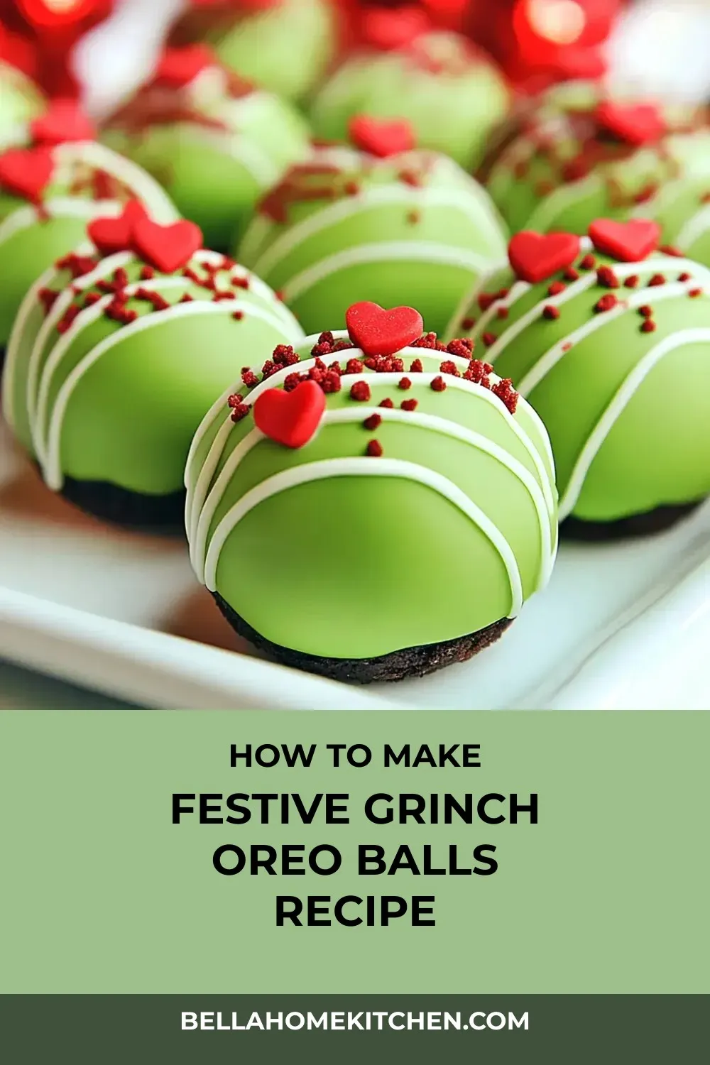 “Festive Grinch Oreo Balls with creamy Red Velvet Oreo center, bright green coating, and cute red hearts – a simple, no-bake holiday treat!”