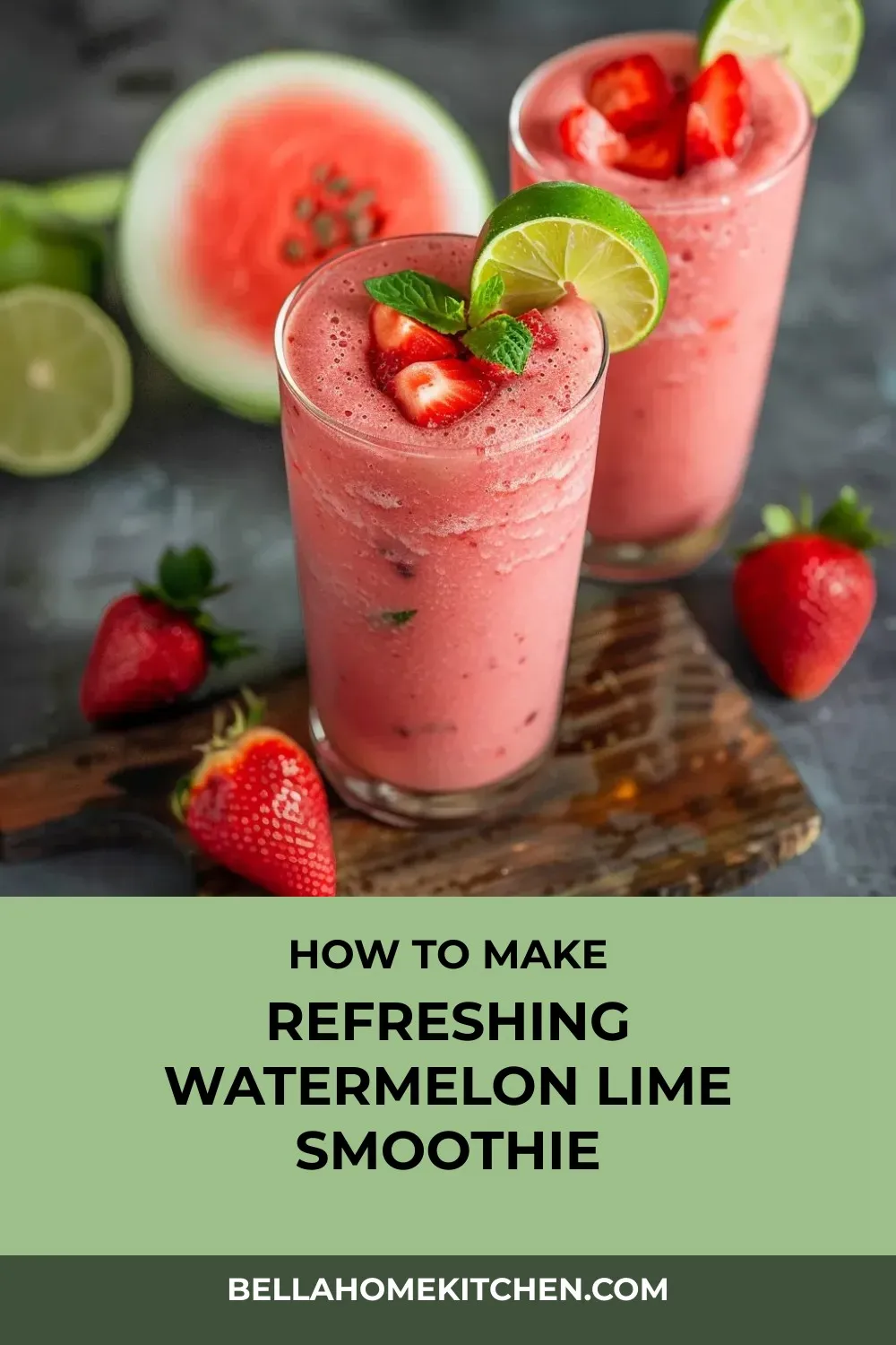 “Blend up a hydrating Watermelon Smoothie with Lime, a refreshing mix of watermelon, strawberries, bananas, and vegan yogurt with a zesty twist – perfect for summer sipping!”